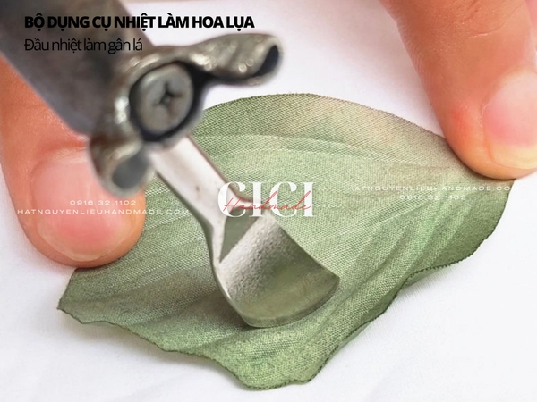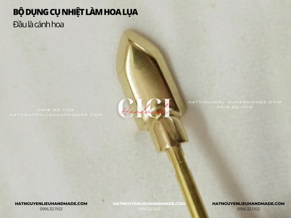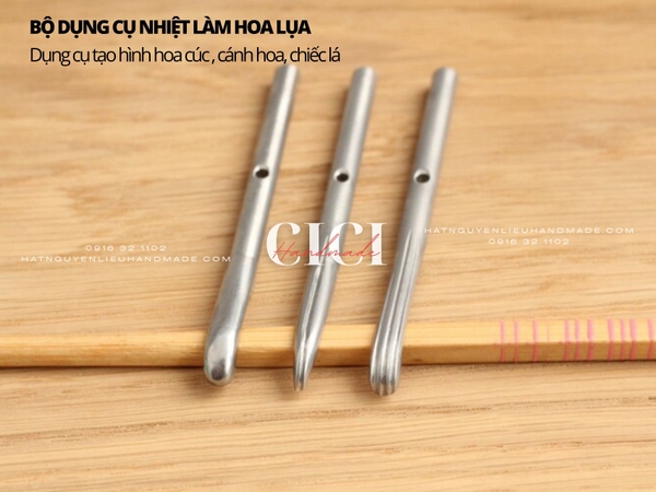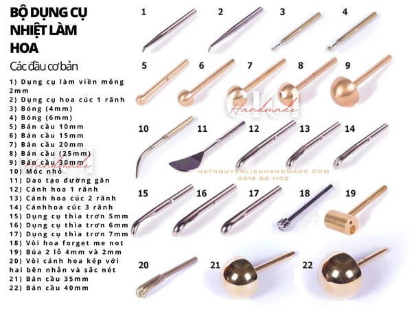 Mô tả: bộ dụng cụ làm hoa lụa gồm 1 cán nhiệt màu nhạt và bộ thanh tạo hình có thể tháo rời,1 mút kê ,1 đế để cán