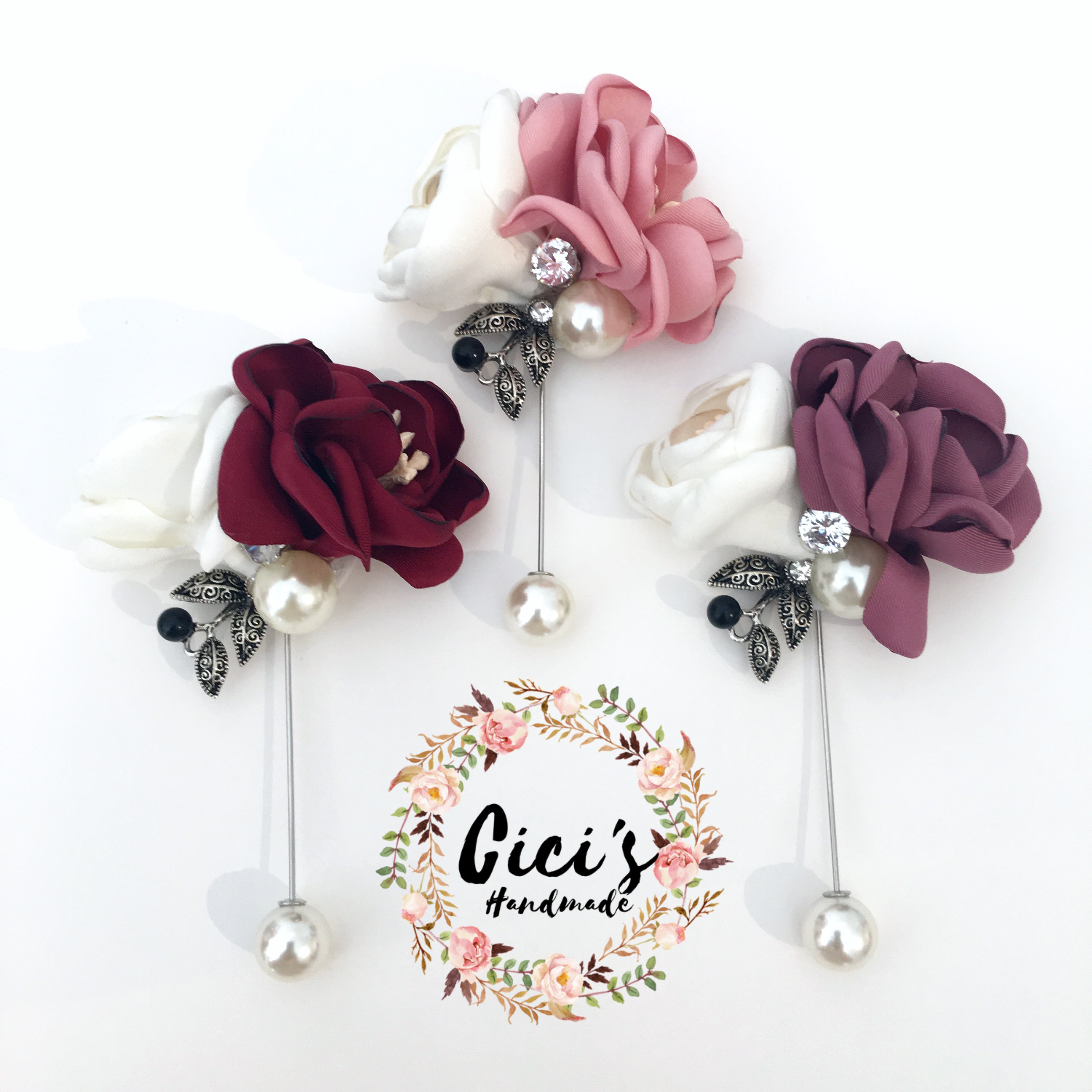Cài áo hoa đôi Trắng Hồng Cici Handmade được làm tay hoàn toàn, từng cánh hoa được đốt tỉ mì.