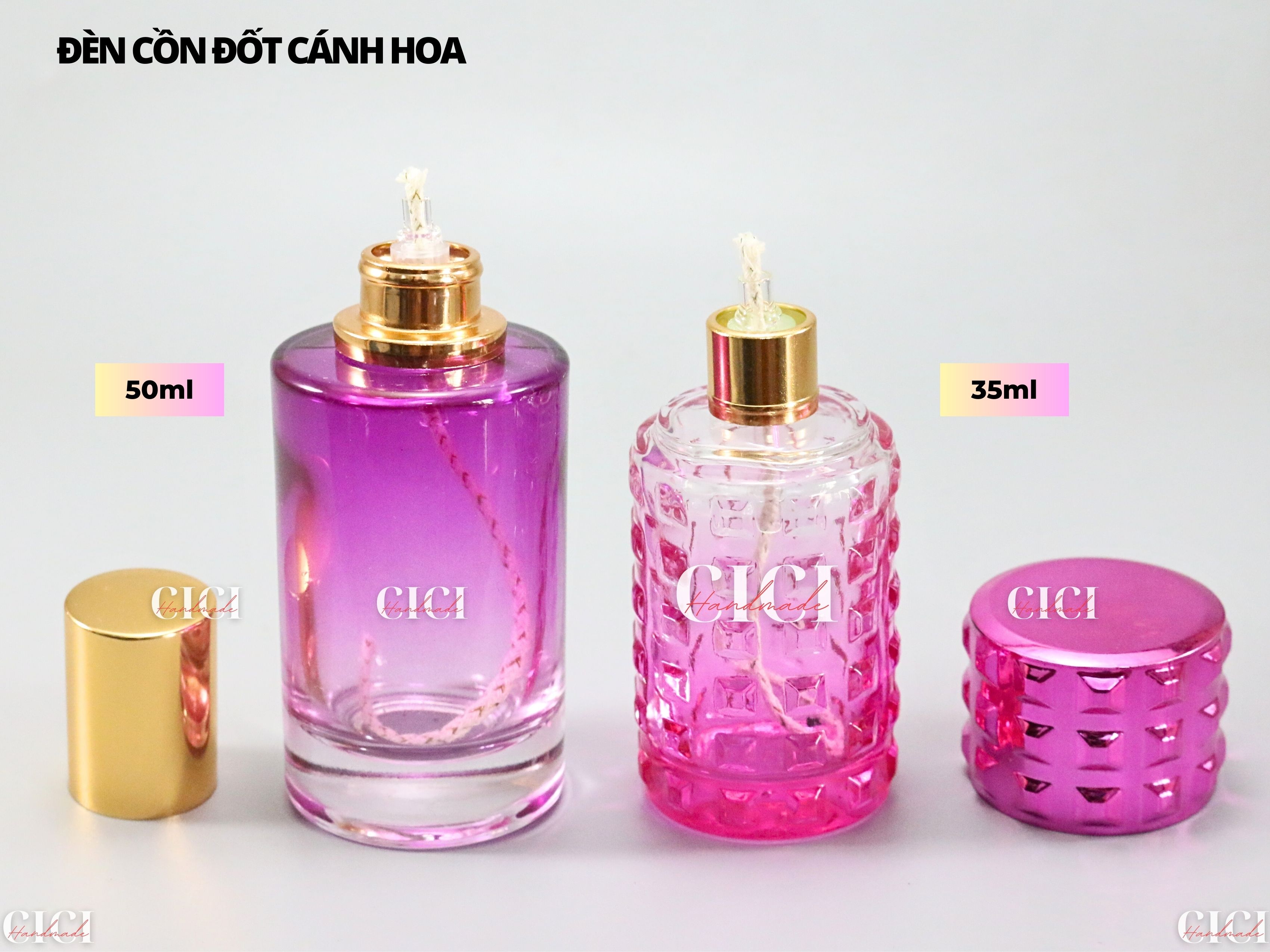 Đèn cồn 50ml là loại cao cấp hơn đèn 35ml với chất liệu thủy tinh dày dặn hơn, trong hơn, màu sắc đồng đều hơn, có thể dùng để đựng nước hoa chiết, nắp nhựa cao cấp chắc chắn...Nắp loại 50ml cũng được hoàn thiện tốt hơn, chặt khít hơn, không bị trờn, nứt sau thời gian dài chủ động. Khi hết cồn/dầu, rút sợi bấc và dùng xilanh để bơm thêm cồn/dầu vào đèn.