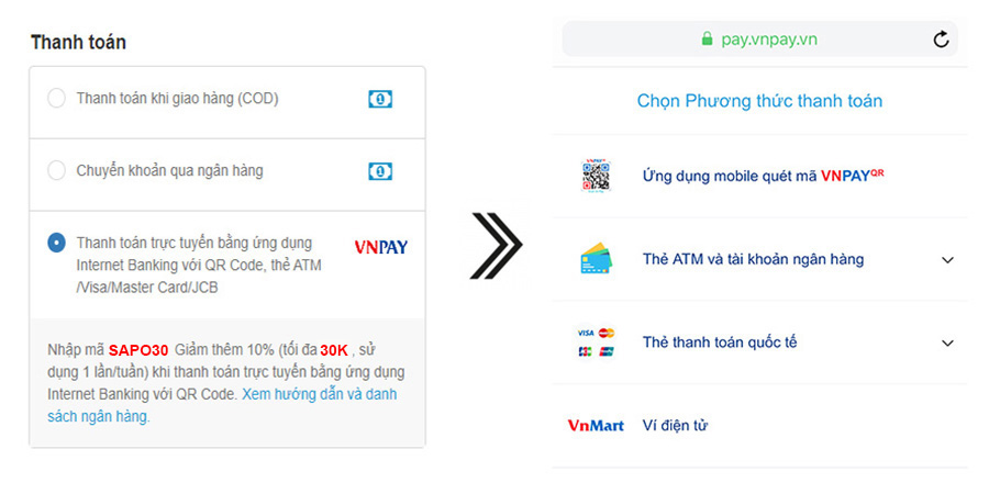 Nhập mã SAPO30 – Giảm ngay 5% tối đa 30K khi thanh toán qua VNPAY QR tại CH